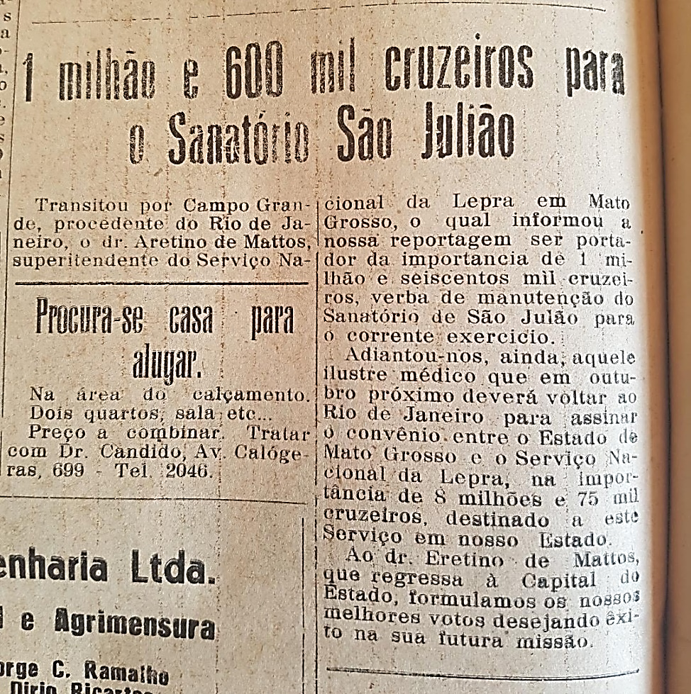 1 MILHÃO e 600 mil cruzeiros para o Sanatório São Julião. Jornal O mato-grossense, Campo Grande, 1960.